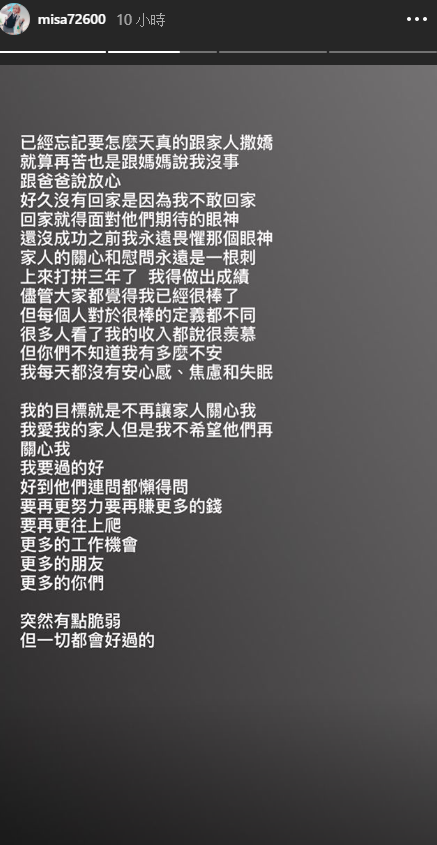 米砂7日在IG限時動態中發文:「已經忘記要怎麼天真地跟家人撒嬌」,她表示自己現在即便再苦也不想讓爸媽擔心,甚至好久沒回家的原因竟是「不敢回家」,直言只要回到家就得面對父母期待的眼神,「家人的關心和慰問永遠是一根刺」。米砂解釋自己已經打拼三年,「我得做出成績」,希望可以讓做的更好讓爸媽不必再為她擔心。