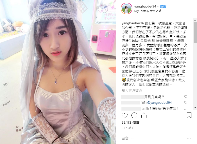 楊寶貝7日透過IG發文,表示:「我們第一次做生意,大家合法合規,有理有據」,表示自己的娃娃機奶茶店付出非常多的心思及血汗錢,相當辛苦。不過她接著提到:「無奈開業一個月多,就面對形形色色的客戶,夾不到就說機器騙錢」,表示無端遇到客人找麻煩,她也做出解釋:「事實上我們的娃娃已經被夾走好幾萬隻了,甚至很多朋友也因此都怕我虧錢,很快倒閉」。