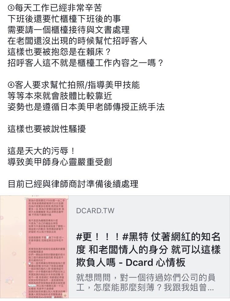 除此之外,原PO也爆料許多夏德萱私下的言行,表示夏德萱表面佯裝因為名氣壓力大,私下卻仗著自己知名度到處招搖!原PO還加碼直說:「網紅之前要教她一些卸甲的姿勢,都靠很近 讓人很不舒服,而且不只教她的時候 幫客人拍照的時候也會」,指出夏德萱職場性騷擾。