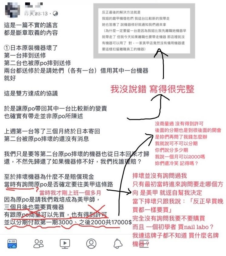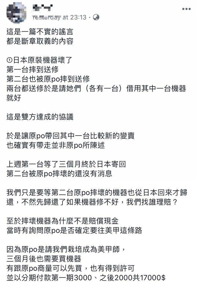 事情爆發之後,美甲店老闆(夏德萱女友)便在臉書PO文,開頭便表示:「這是一篇不實的謠言,都是斷章取義的內容」,更針對原PO所說之處一一反駁,表示自己不是惡意扣留美甲機,而是因為原PO所摔壞的美甲機還沒修好,所以才不能歸還。而針對原PO所說夏德萱性騷擾一事,美甲店老闆則說:「幫客人拍照、指導美甲本來就會肢體比較靠近,姿勢也是遵循日本美甲老師正統手法,這樣也要被說性騷擾,這是天大的污辱,導致美甲師身心靈嚴重受創」。對於Dcard文中所說一概否認。最後她也強調:「已與律師商討後續處理」,疑似將會上法院提告。