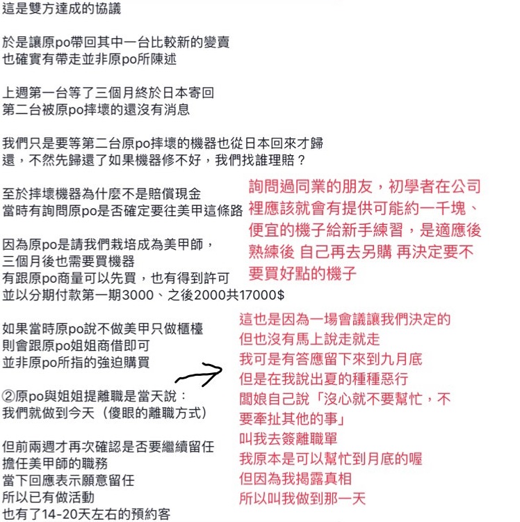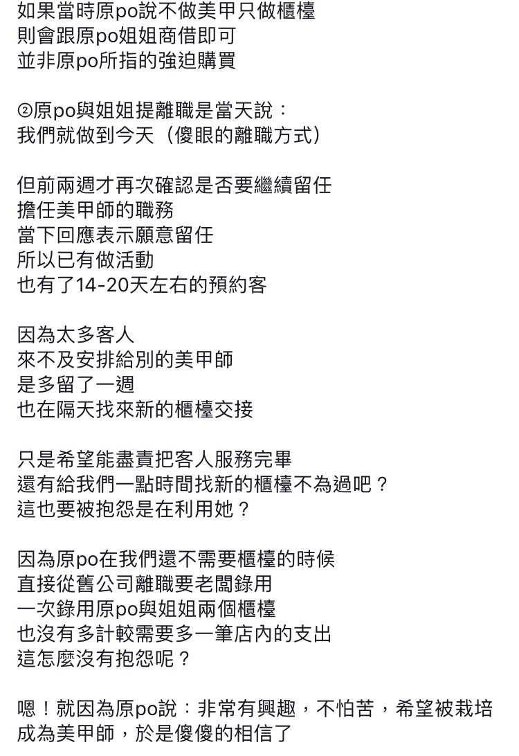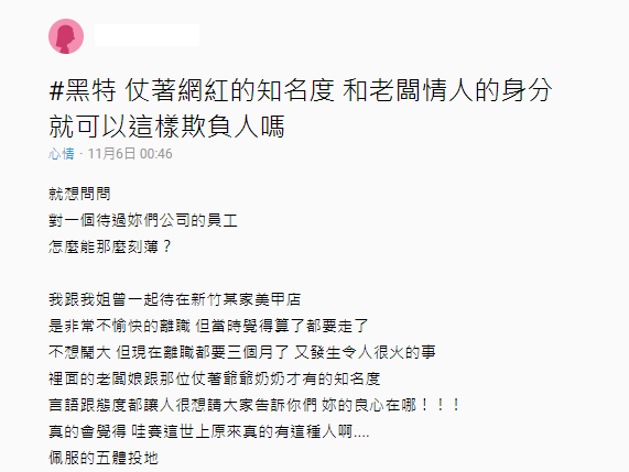 還跟我姐說「其實外面還有很多家美甲店 妳可以去看看 如果妳覺得網紅不會教的話 那我覺得外面沒有人能教妳了耶~」「我覺得妳適合行政 還是妳要坐回櫃檯?」 我覺得真的超級超級欺負我姐
