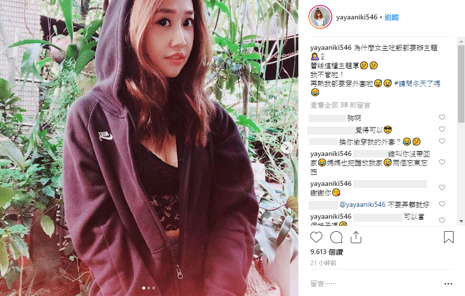 亞亞昨(7)日在IG中發文:「為什麼女生吃飯都要辦主題,蕾絲這種主題厚,我不管啦!再熱我都要穿外套啦」,照片中的她穿著低胸黑色蕾絲,性感展現事業線,尤其腰部的部分更是完全可以直接透視,相當火辣!而也因為亞亞外頭罩著運動外套,也讓照片中的她更顯性感。