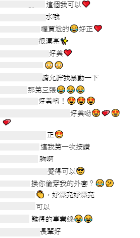 照片上傳之後,粉絲則紛紛留言:「這個我可以」、「很漂亮」、「請允許我暴動一下」、「好美唷!」、「胸啊」、「覺得可以」、「難得的事業線」、「好漂亮好漂亮」、「這衣服小性感!」、「我只看到很胸啊!」、「長輩好」、「妳怎麼這麼可愛」。