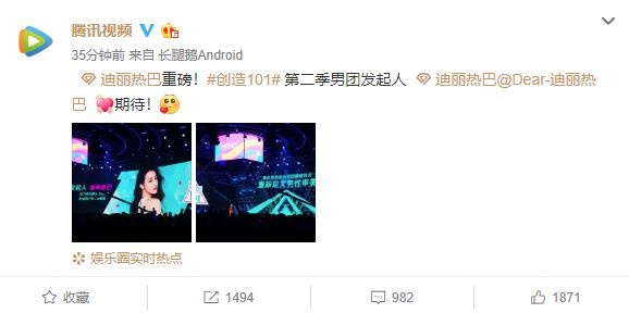 8日下午,騰訊舉辦創造101第二季發布會,新一季將改成男團選拔,且邀請當紅藝人迪麗熱巴作為主持人。同時迪麗熱巴也現身發布會現場,甚至透露自己從第一季就是忠實觀眾,並且對於舞台上選手的點滴感同身受,並回憶到「很像自己的經歷,從配角到被人關注,到站在這個舞台」,由於迪麗熱巴擁有芭蕾背景,現場甚至跳起《創造101》主題曲的舞蹈,模樣相當俏皮可愛,消息一出網友已經敲碗期待。