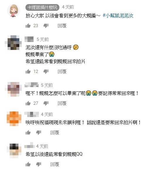 時隔五個月後,面臨蜆編的離開,也讓許多粉絲感到很遺憾,但仍支持的說:「蜆蜆畢業了,希望還能常看到蜆蜆回來拍片」、「喔不!蜆蜆怎麼可以畢業了呢 要記得常常回來喔!」、「唉呀唉祝福硯硯未來順利喔!話說還是要常回來拍片啊!」、「希望以後還能常看到蜆蜆QQ」