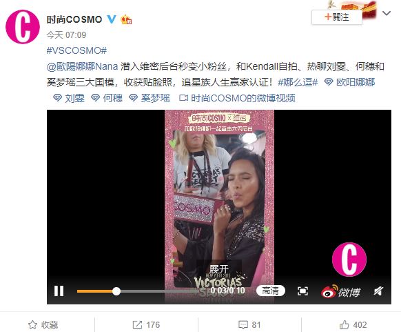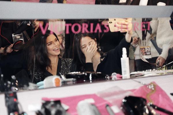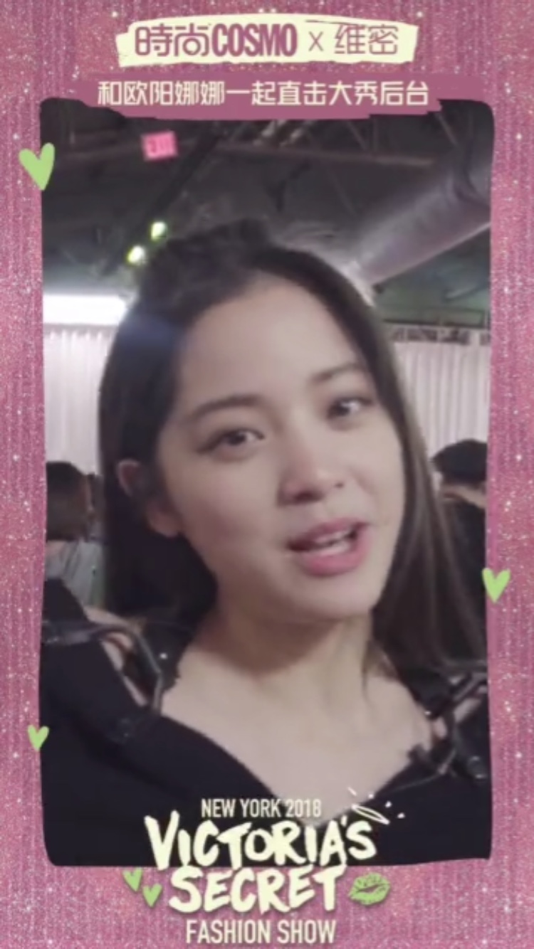 今日,歐陽娜娜再次分享和超模們在後台的合照,包括坎達爾珍娜(Kendall Jenner,以及大陸國模劉雯、何穗和奚夢瑤,貼臉合照讓外界相當羨慕。此外,歐陽娜娜也透過抖音實況轉播維密後台狀況,影片一開始,歐陽娜娜就興奮說到「我現在在維密後台了」,更在和超模坎達爾拍照後,少女心噴發害羞掩面說到「我和坎達爾合照了」。