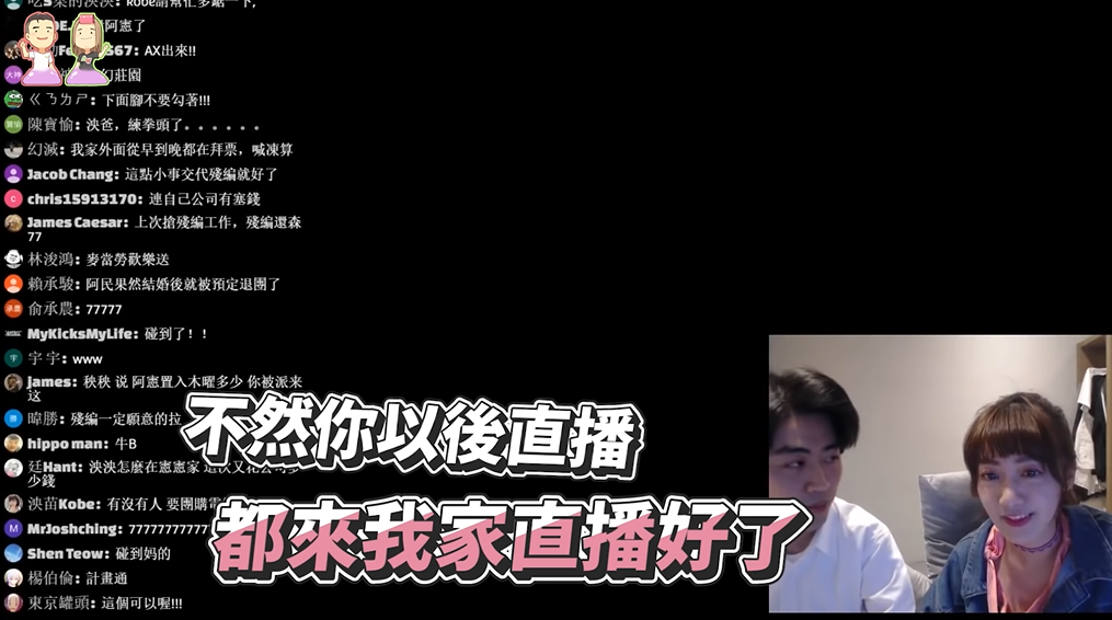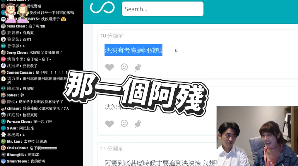 後來阿憲也和泱泱一起回答粉絲問題,其中便有粉絲詢問:「憲在心裡感覺如何?各位該追殺了」,也讓泱泱故意碰阿憲的肩膀,開玩笑直說:「各位是不是該追殺了」,笑翻粉絲。不過事實上直播中不管阿憲怎麼丟球,泱泱卻全部敷衍忽略,閃避技能滿點,就連粉絲提問「泱泱有考慮過阿殘嗎」,泱泱也回答:「哪一個阿殘」,讓阿憲心碎。