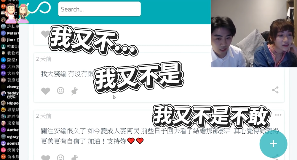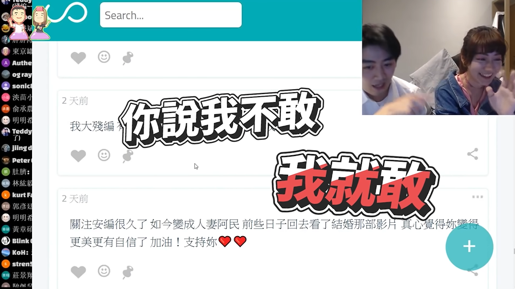 不過後來也有許多粉絲詢問阿憲「有沒有跟泱泱告白過」,讓阿憲尷尬直說:「我又不是...我又不是...我又不是不敢」,泱泱則說:「我覺得他不敢」,讓阿憲被激到直說:「你說我不敢我就敢」,曖昧的互動讓直播充滿粉色泡泡。
