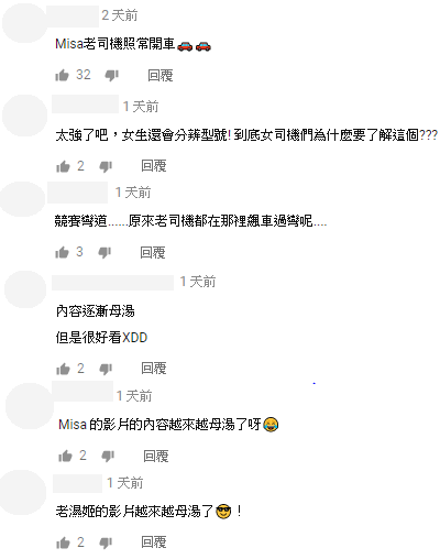 影片播出之後,許多網友紛紛留言:「老濕姬的影片越來越母湯了」、「Misa 的影片的內容越來越母湯了呀」、「內容逐漸母湯 但是很好看XDD」、「這集直接油門踩到底喔!」、「太強了吧,女生還會分辨型號! 到底女司機們為什麼要了解這個???」。