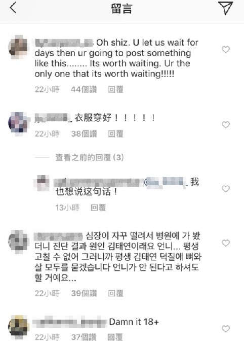 此張火辣照片也撩得粉絲著急地說:「衣服穿好!!!!!」,也有別的粉絲回應此留言:「我也想說這句話!」,還有許多外國粉絲連連讚嘆,並且說:「Damn 18+」,