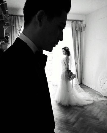 在「喻虹淵」分享的照片中,可以看到周渝民梳起俐落油頭,身穿黑色正裝,並打上蝴蝶結領結,側臉看向老婆帥氣指數爆表,周渝民一手插口袋,一手則是和老婆十指緊扣,寵溺的凝視這老婆,滿滿粉紅泡泡閃的讓人睜不開眼啦!而喻虹淵則是披上蕾絲頭紗,穿上一襲純白蕾絲禮服,肩膀的透視布料和側乳旁挖空的剪裁,俏皮之餘更露小露性感,展現纖瘦曲線,格外突顯其優雅。