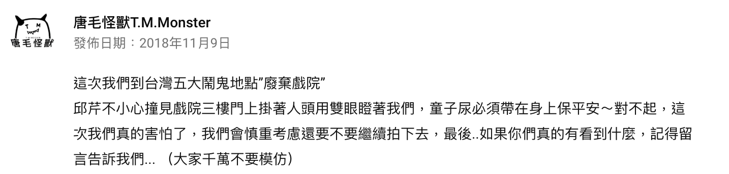唐毛怪獸也留言表示要大家千萬別模仿:「這次我們到台灣五大鬧鬼地點”廢棄戲院” 邱芹不小心撞見戲院三樓門上掛著人頭用雙眼瞪著我們,童子尿必須帶在身上保平安~對不起,這次我們真的害怕了,我們會慎重考慮還要不要繼續拍下去,最後..如果你們真的有看到什麼,記得留言告訴我們... (大家千萬不要模仿)」。