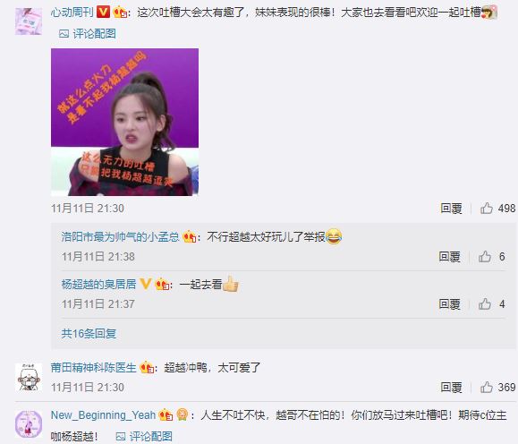 此外,楊超越還在節目中清唱「燃燒我的卡路里」自嘲自己的唱歌功力「跟CD一樣」,事實上火箭少女推出歌曲《燃燒我的卡路里》,其中楊超越經這句經典副歌歌詞,曾被網友評論「要破音不破音的」,如今楊超越靠著不造作也持續努力的形象成功獲得外界認同,網友針對此次「吐槽」紛紛表示「沙雕其實也是種才藝」、「超越是真的搞笑」。