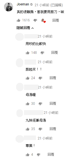而影片上傳之後,Joeman便有在下方留言:「真的很難撕,害我要用剪刀,唉」,放閃的留言更在短時間便有破千按讚,也引起許多網友留言:「用咬的比較快」、「九妹逐漸母湯」、「九妹應該比較熟練」、「母湯喔」、「剪起來!!」、「這……拍給九妹看的吧」。