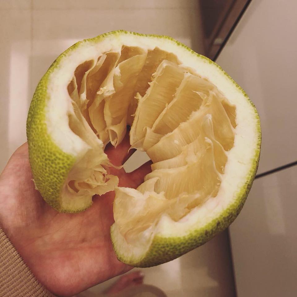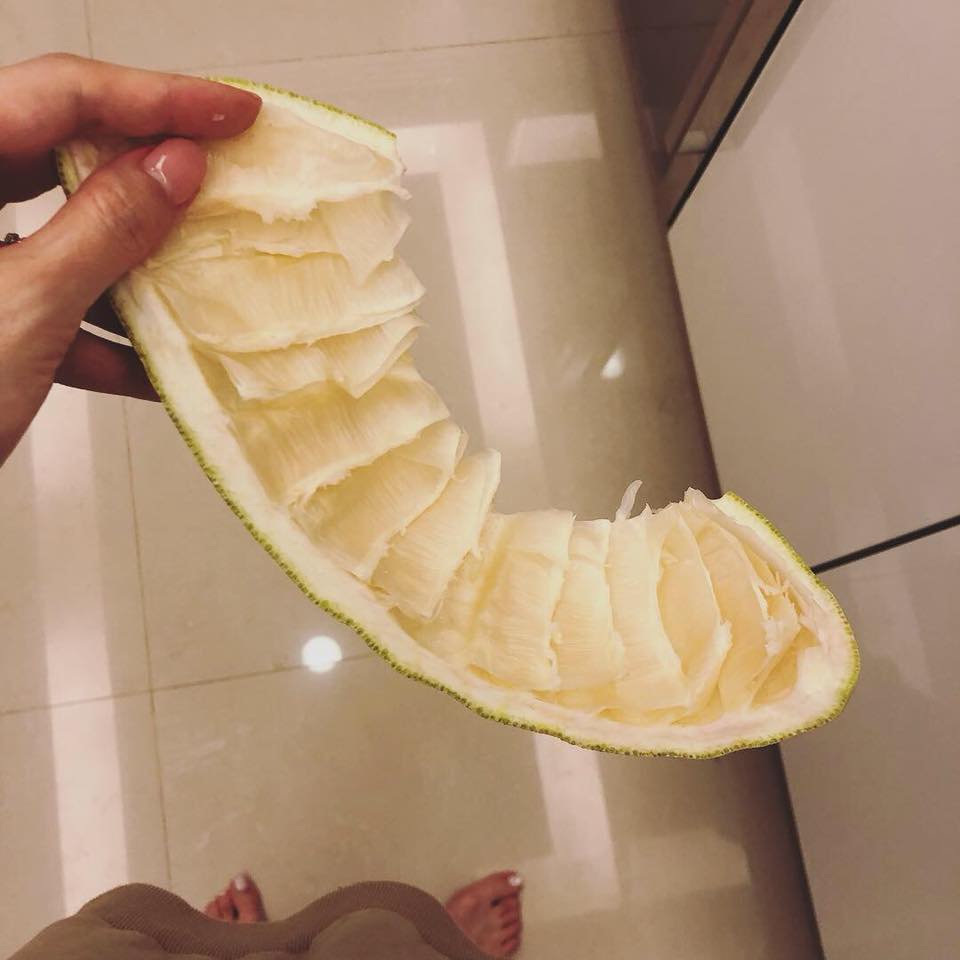 隋棠發文寫著:「陳姐教我一招吃柚子大法,吃完全部的果肉後,要進垃圾桶的就只有這樣一條果皮,好乾淨,吃柚子居然可以不再剝得亂七八糟」,笑說自己真的是「活到老學到老」。