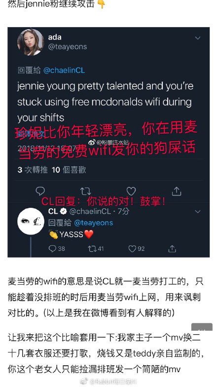 12日適逢Jennie單曲發行,就有Jennie粉絲在Twitter上開嗆CL,並表示「Jennie比你年輕漂亮」,而CL竟不甘示弱回應粉絲「你說的對」並附上鼓掌符號。此前,CL就在Twitter上發文,被外界懷疑暗指Jennie實力不足,文中顯示「你不要期望兔子可以殺死老虎」,意外和Jennie粉絲展開鍵盤戰。