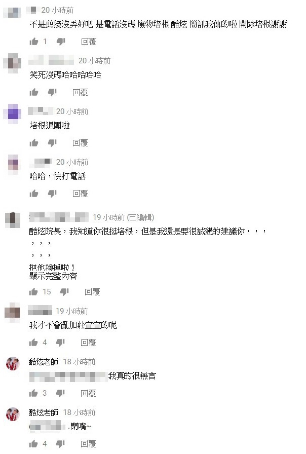 而網友們也都紛紛回應留言,網友們都說:「不適剪接沒弄好吧 是電話沒碼 廢物培根 酷炫 簡訊我傳的啦 開除培根謝謝」、「笑死沒碼哈哈哈哈哈」、「培根退團啦」、「哈哈,快打電話」、「酷炫院長,我知道你很挺培根,但是我還是要很誠懇的建議你 把他換掉啦!」、「我才不會亂加莊宣宣的呢」,酷炫也直接回覆兩位網友的留言:「我真的很無言」、「閉嘴~」