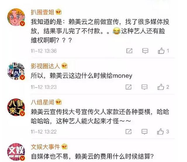 最近,有一大群自媒體營銷號,集體跑到賴美雲的所屬經紀公司「齊鼓文化」官方微博下聲討,表示之前公司為了幫賴美雲做宣傳,找了很多網路媒體發消息,但由於事後公司一直積欠宣傳費,才出現了集體“討薪”行為。還有許多小帳號,在賴美雲的粉絲後援會的微博上,狂刷負面留言評論:「小賴變老賴」、「賴賬雲太丟人了欠了媒體的錢不換」、「賴美雲大騙子」