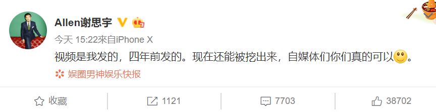 14日下午,這位古力娜扎大學時期的男朋友終於在微博發文承認,影片是自己上傳的,並說到「視頻是我發的,四年前發的。現在還能被挖出來,自媒體們你們真的可以」,引起網友一片撻伐,認為明知道古力娜扎是公眾人物卻還是將影片外流。