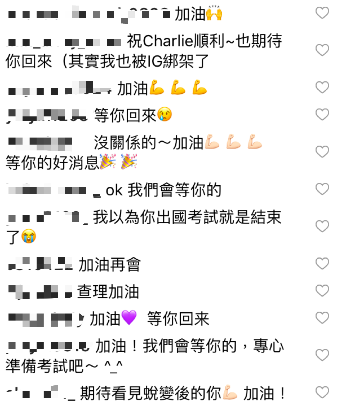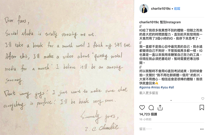 然而,在13日時查理在Instagram上發布一則他將要暫別IG的貼文,他提到IG給了他很多異想不到的體驗,但隨之而來的是大把的時間跟壓力,直到前天他發現一天竟然用了3個小時的IG,現在的他必須把書唸好,暫時需要把專注移開,「所以我暫時不會用IG直到考試結束」,但他也和粉絲們約定很快就會回來的。網友看見後也紛紛為他加油打氣:「You can make it! All the best 」、「查理加油~ 等你回來~」、「謝謝你,你的影片拓寬我對音樂的喜好,考試加油,GO GO~」、「不管到什麼時候,我們都會等的!」、「查理加油!」、「沒關係的~加油等你的好消息」