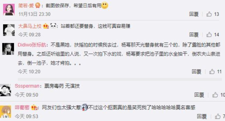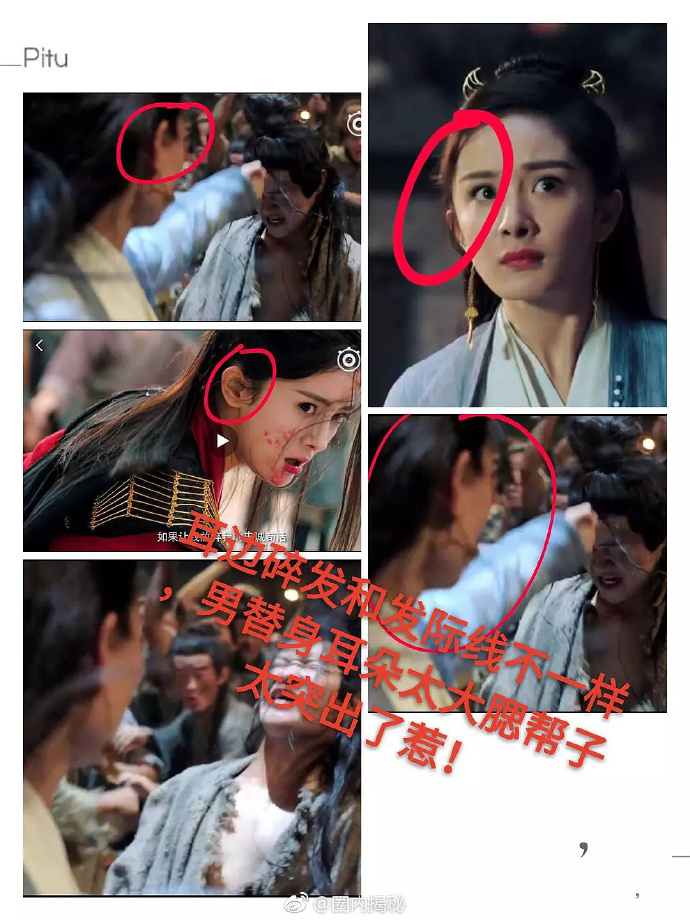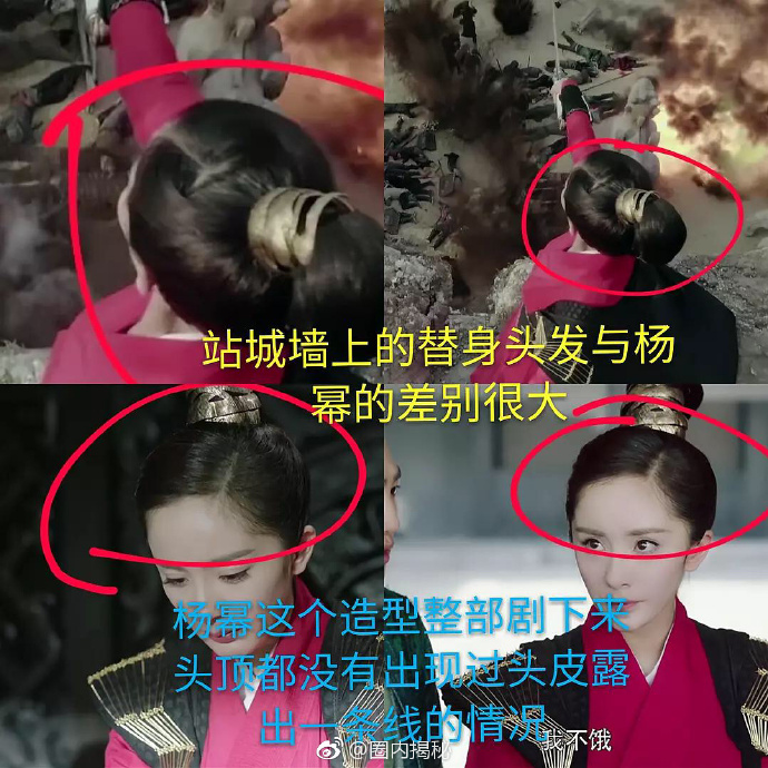 該名網友爆料楊冪拍戲過程中動用了百位替身,甚至就連站著、跑步都不是全程親自演出,更指出多張不合理鏡頭力證事實。包括髮色從棕色變成黑色,或是頭頂突然出現了不同的髮際線,武打戲碼甚至明顯露餡使用男替身,並指出不管是正臉大小、耳朵長度都和楊冪本身的五官非常不同,並直呼「現在明星的錢也太好賺了」。