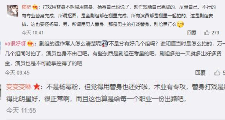 對此,雖有網友相信百位替身是事實,但也有部分網友出面替楊冪闢謠,並指出沙漠戲碼剛好和電影《寶貝兒》撞檔期因此楊冪不得不事後補拍,而動用替身也是劇組考量,跟演員本身意願無關。