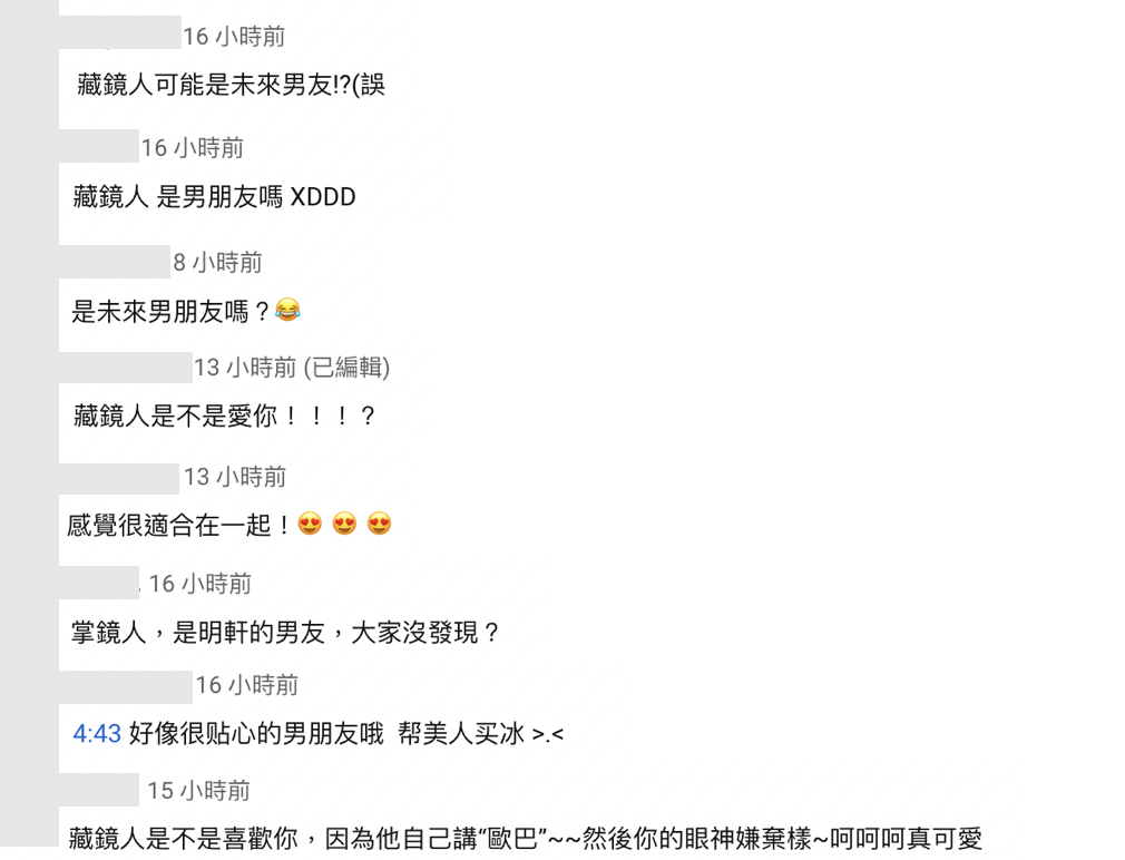 看完影片的許多網友都在猜測那位藏鏡人的身份,是不是鍾明軒的男朋友,紛紛表示:「藏鏡人是男朋友嗎 XDDD」、「藏鏡人可能是未來男友!?(誤」、「掌鏡人,是明軒的男友,大家沒發現?」、「是未來男朋友嗎?」、「感覺很適合在一起!」、「好像很貼心的男友,幫美人買冰」、「藏鏡人是不是喜歡你,因為他自己講“歐巴”~~然後你的眼神嫌棄樣~呵呵呵真可愛」、「藏鏡人是不是愛你!?」