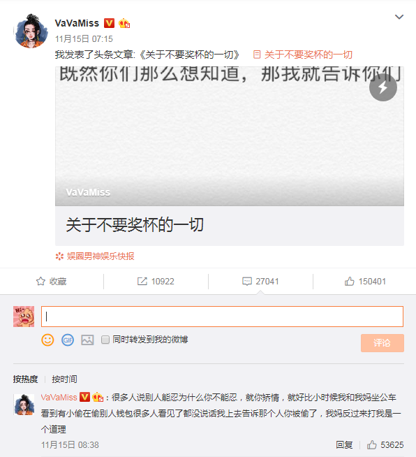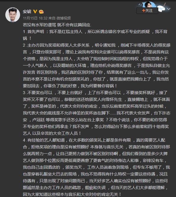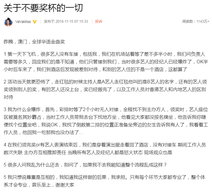 事情越鬧越大,VAVA本人也再微博發文說明「關於不要獎杯的一切」,一共提出了許多點說明當時讓自己發火的原因,像是她在機場等了半小時才有工作人員來接機,住的飯店被差別待遇,彩排時無人接應,典禮上藝人座位區被霸佔,工作人員還要她隨便找位子,紅毯主持人叫錯藝人名字,典禮頒錯獎杯,主辦方還互相推卸責任等。