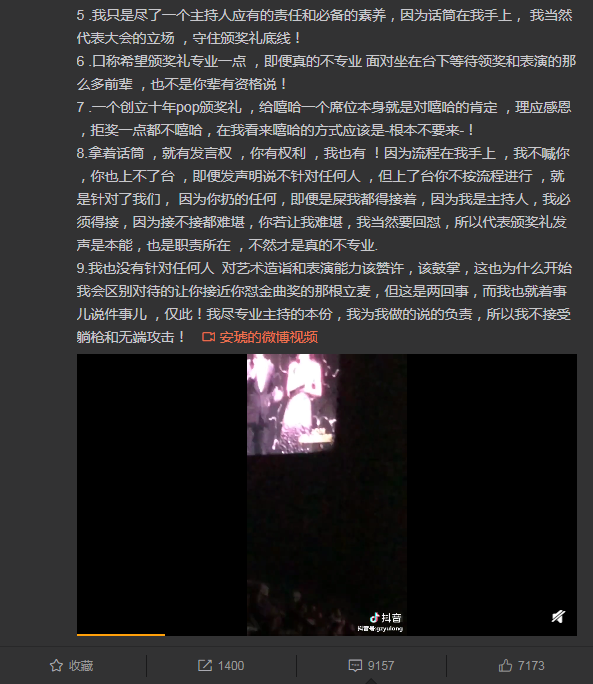 這時頒獎主持人安琥趕緊出來緩解氣氛,說到「一個頒獎典禮上沒有什麼亂還是不亂,因為所有的工作人員辛苦過後,對整個舞台的編排和接待藝人的工作,都付出了辛苦的努力,所以我覺得不尊重這個獎項的歌手,我們不要也罷!」,但事情並沒有因此結束,安琥隔天又發文,文章洋洋灑灑列了數點批評VAVA,認為她的行為非常「不專業」,當中第6點更抨擊VAVA「口稱希望頒獎專業一點,即便真的不專業,面對坐在台下等待領獎和表演的那麼多前輩,也不是你輩有資格說」,安琥表示一個創立十年pop頒獎禮,給嘻哈一個席位本身就是對嘻哈的肯定,理應感恩,拒獎一點都不嘻哈,在他看來嘻哈的方式應該是「根本不要來」才比較是嘻哈的行為。