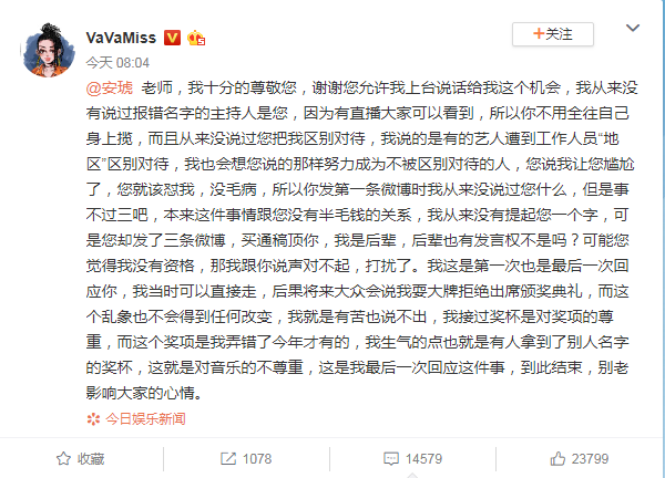 16日一早VAVA發文向安琥喊話,文中表示其實十分的尊敬安琥,感謝他讓自己上台說話,並說自己從來沒有說過報錯名字、差別對待的人是安琥,安琥不需把責任朝身上攬,也表示自己會努力成為不被區別對待的人,又說自己讓安琥尷尬了被怨懟無話可說,看似道歉文的最後,VAVA又寫道,「本來這件事情跟您沒有半毛錢的關係,我從來沒有提起您一個字,可是您卻發了三條微博,買通稿頂你,我是後輩,後輩也有發言權不是嗎?可能您覺得我沒有資格,那我跟你說聲對不起,打擾了。」看來在短期之內兩人心結還是無法消除。