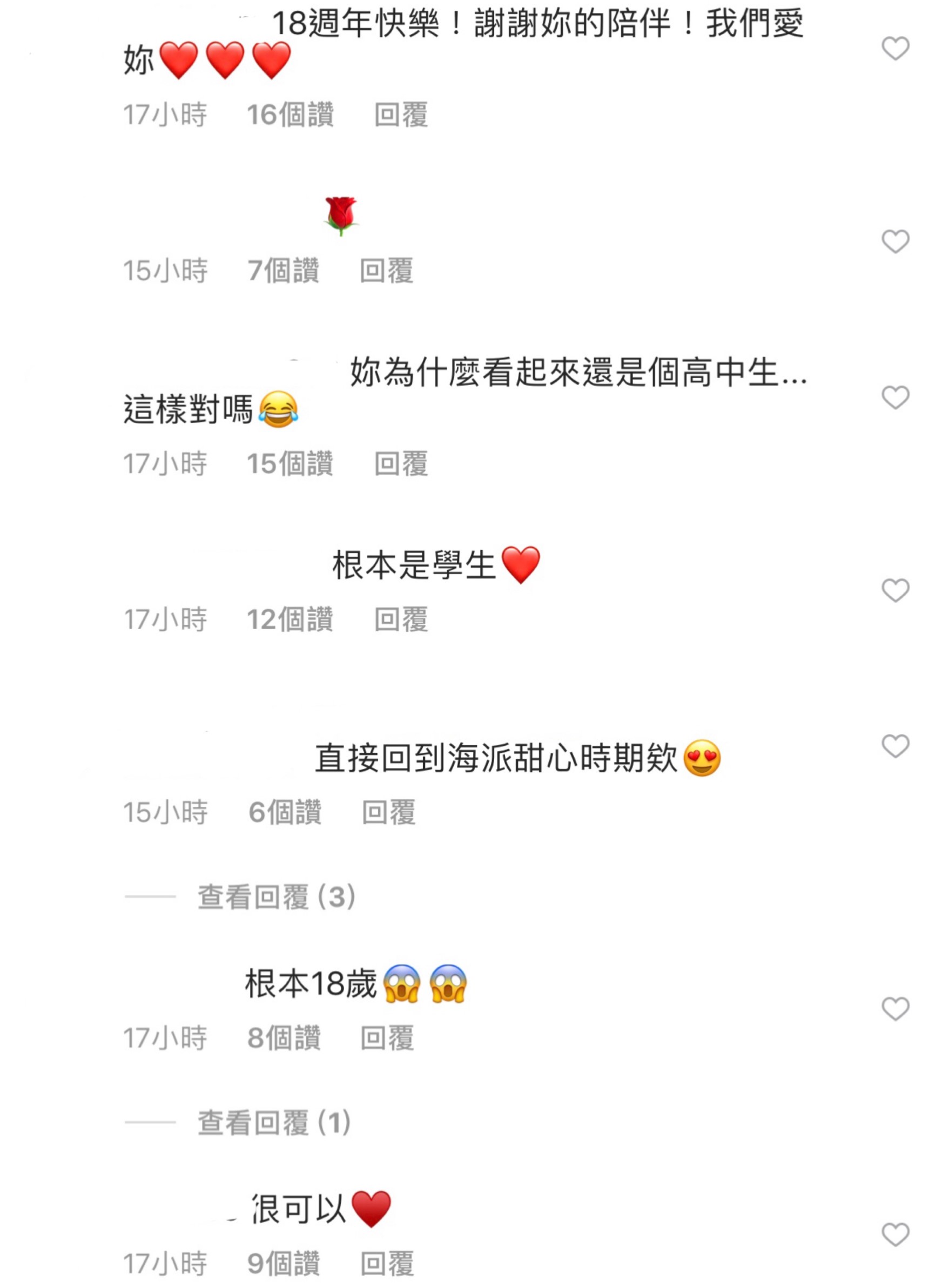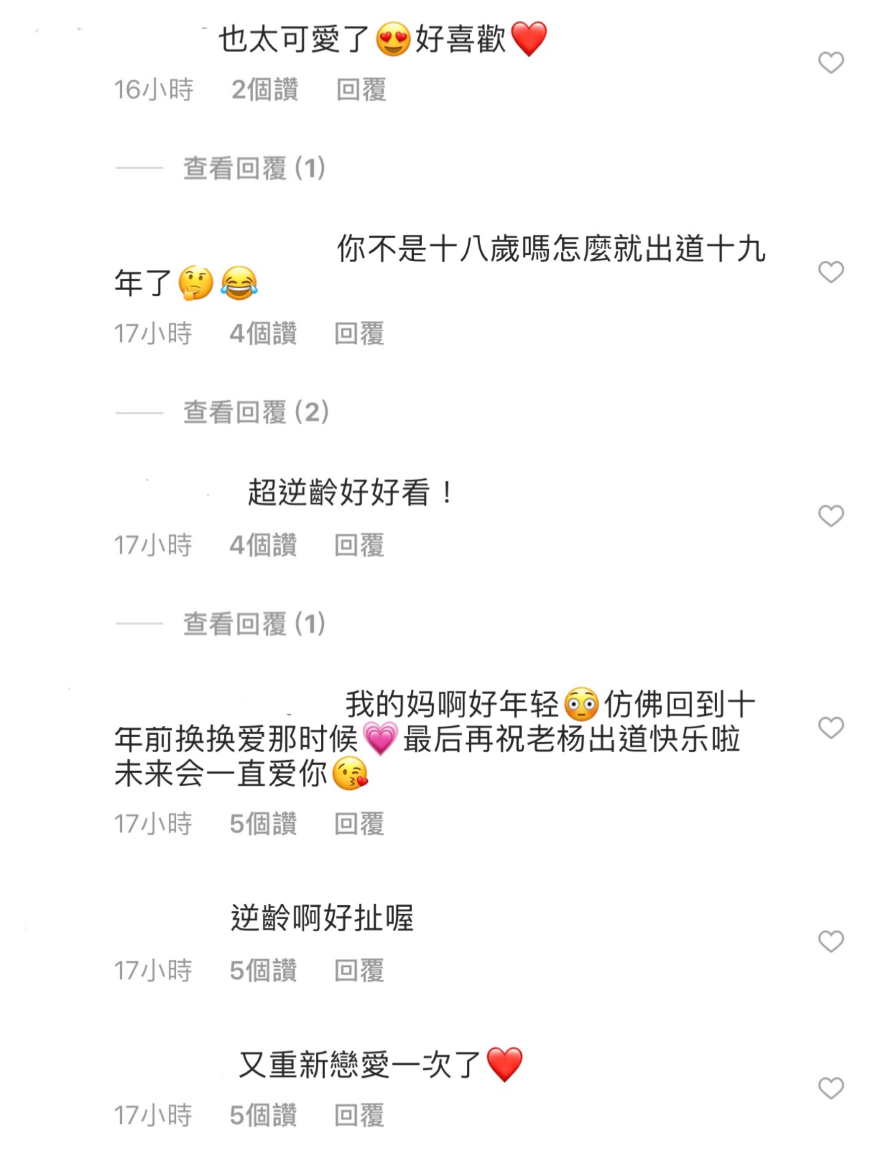 最後「楊丞琳」也不忘於文中向粉絲喊話「感謝你們一路上的陪伴。能夠把自己用心並滿意的作品交給你們,是最快樂的事!能夠擁有你們這些房東,是最幸福的事!能夠一起成長一起變老,是最浪漫的事」。粉絲看了忍不住驚呼:「根本18歲」、「妳為什麼看起來還是個高中生...」、「超逆齡超好看」、「妳不是才18歲嗎怎麼就出道19年了」。