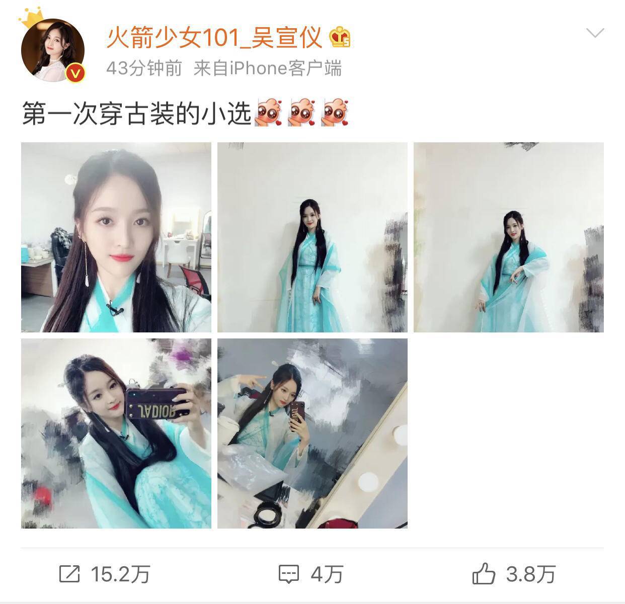 15日中午,吳宣儀透過微博發布自己的「古裝仙照」啦~吳宣儀首次的古裝照一PO網即刻引起網友們的熱烈回應。原來這次的裝扮是應綜藝節目《哥哥別鬧啦》需求,照片中的吳宣儀留著及腰長髮,身著淡藍色的古裝,全身散發著仙清,清新脫俗,好不夢幻,惹得網友們也紛紛直呼:是仙女下凡沒錯!雖然發文PO出時,這期節目尚未播出,但就光憑吳宣儀這一身清新古裝,就足以讓觀眾們更加期待節目的播出!!!