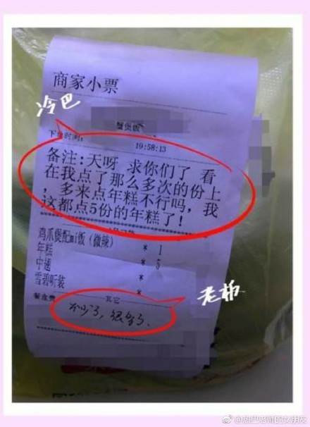 8日,迪麗熱巴工作室官方微博曝光迪麗熱巴晚上叫外賣的單據,單子上除已經叫了多份餐點,迪麗熱巴甚至以「熟客」之姿,向老闆討價還價。單據中顯示,迪麗熱巴叫了五份年糕、雞腳煲飯、雪碧和雞翅若干份,然而愛吃的迪麗熱巴忍不不住向老闆要求點餐優惠,並註明到「求你們了,看在我點了這麼多次的份上能不能多給點年糕,自己都點了五份了!」看來是迪麗熱巴時常捧場的店家。