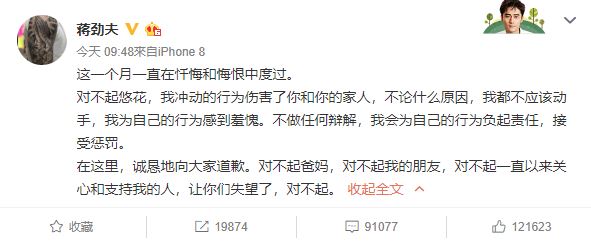 9月以前,蔣勁夫還陸續在微博放閃,10月之後就下落不明,如今20日施暴案爆發後,蔣勁夫首度在微博回應「我動手了」向外界致歉。開頭就表明消失的一個月蔣勁夫「一直在懺悔和悔恨中度過」,並向女友悠花道歉並說道「我衝動的行為傷害了你和你的家人,不論什麼原因,我都不應該動手,我為自己的行為感到羞愧。」最後也表示辜負外界期望並數次致歉「對不起爸媽,對不起我的朋友,對不起一直以來關心和支援我的人,讓你們失望了,對不起」部分網友除表示無法相信,更多視在她過去的放閃照留言痛罵,讓過往甜蜜如今顯得相當諷刺。