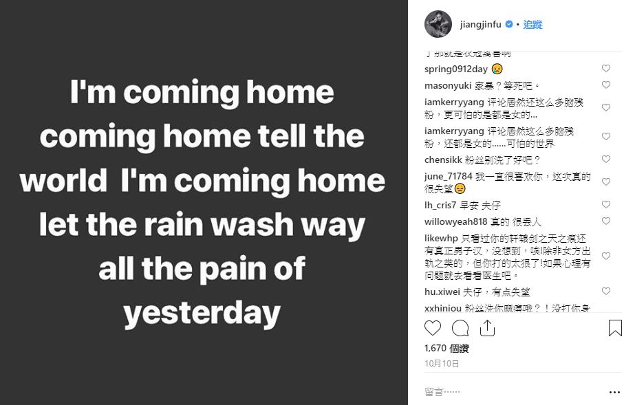 在爆發家暴案和失蹤案前,10月10日蔣勁夫就曾在個人Instagram分享一則英文貼文,似乎在預告即將歸國,文中最後一句「Let the rain wash away all the pain of yesterday」由於看來情緒陰鬱,不少網友關心表示「分手了吧照片都刪了」、「還好嗎」、「快回來吧」,如今家暴案爆發讓粉絲都難以置信。