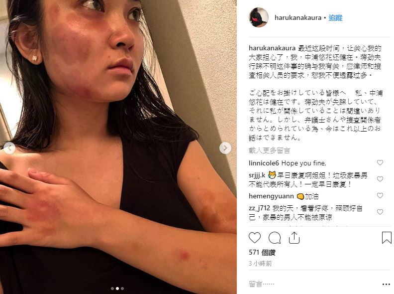 20日,蔣勁夫女友在Instagram上發出三張「全身瘀血照」,不僅景象駭人,文中更控訴男友蔣進夫家暴事件,並爆料10月傳出在日本失蹤事件也和她有關。文中以中日文雙語行文知道外界的關切並表明「我,中浦悠花還健在」,接著更踢爆「蔣勁夫行蹤不明這件事的確與我有關」,此外,也已經將系列事件訴諸法律行動,蔣勁夫的失蹤和女友的家暴控訴讓外界霧裡看花。