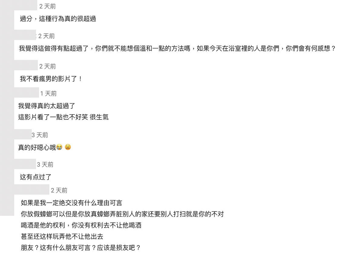 事後三度也承諾以後不會再因為喝酒而耽誤公事了,也開玩笑表示:「今天也是我們最後一天當朋友了」,雖然三度和瘋男是熟識的朋友,但許多網友覺得此做法非常不妥當,紛紛留言表示:「過分,這種行為真的很超過」、「真的好噁心哦」、「我覺得這做得有點超過了,你們就不能想個溫和一點的方法嗎,如果今天在浴室裡的人是你們,你們會有何感想?」、「我不看瘋男的影片了!」、「這有點過了」、「我覺得真的太超過了這影片看了一點也不好笑 很生氣」、「如果是我一定絕交沒有什麼理由可言,你放假蟑螂可以但是你放真蟑螂弄髒別人的家還要別人打掃就是你的不對,喝酒是他的權利,你沒有權利去不讓他喝酒,甚至還這樣玩弄他不讓他出去 朋友?這有什麼朋友可言?應該是損友吧?」