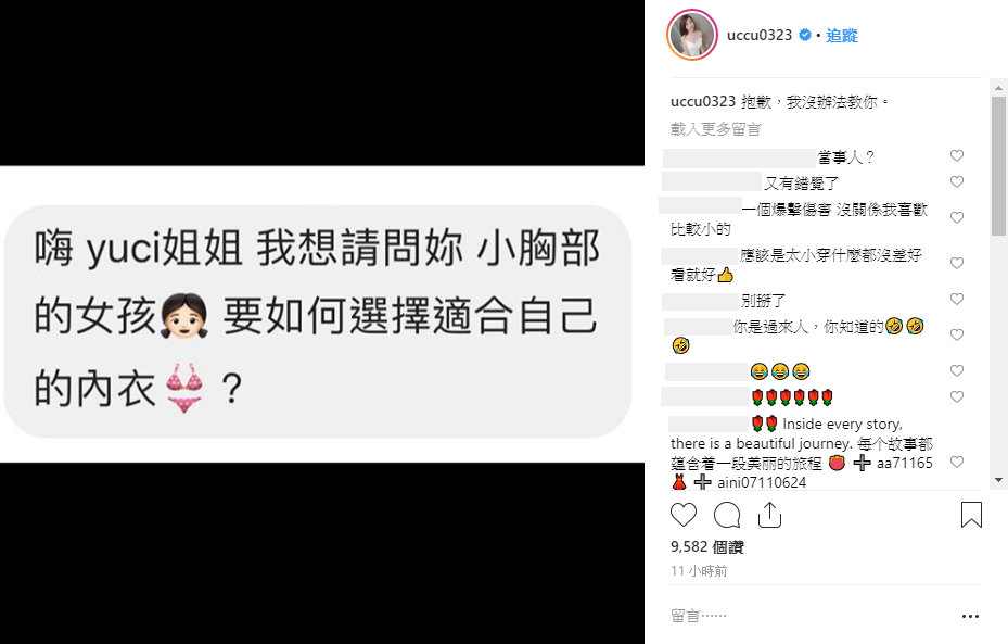 瑀熙過去便曾經表示自己相當在意胸部大小,20日她在IG中公開網友的對話截圖,只見對方寫到:「嗨,yuci姐姐,我想請問你,小胸部的女孩要如何選擇適合自己的內衣?」,暗示瑀熙小胸部的問題讓她直說:「抱歉,我沒辦法教你」,使粉絲笑翻。