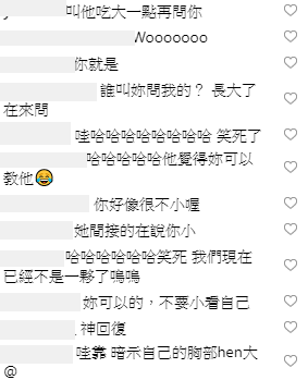 瑀熙發布之後,許多網友也紛紛回覆:「哇靠 暗示自己的胸部hen大」、「他認定你是小胸部」、「神回覆」、「這一問就受傷了!下次得婉轉一點」、「可以教我怎麼睜眼說瞎話嗎?」、「叫他吃大一點再問你」、「哇哈哈哈哈哈哈哈哈 笑死了」、「這妳應該要會的」。