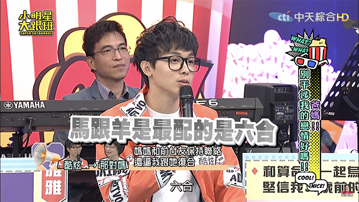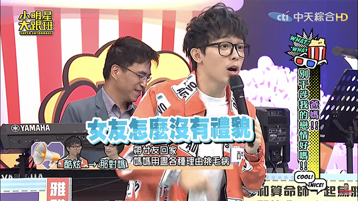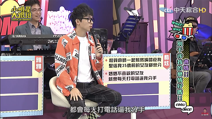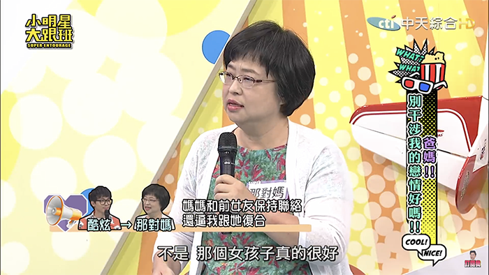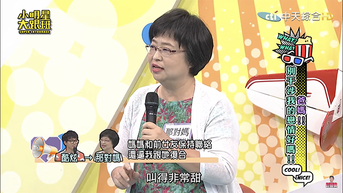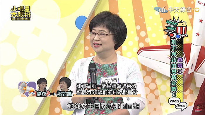 這集⟪小明星大跟班⟫的主題是談論爸媽干涉小孩的戀情,酷炫也列出四點要來控訴媽媽,像是:「會和算命師一起唱衰,認為35歲前交的女友都會分手」、「帶女友回家,媽媽用盡各種理由挑毛病」、「逼迫和前女友復合」、「規定女友的年齡、身材、星座、血型」。過去他只要交了女朋友帶回家給媽媽看,她就會先開始從面相看,接著進行身家調查,問人家住哪裡、經濟狀況如何等等,還會把女方的生辰八字拿去算,只要媽媽不喜歡就會打電話逼酷炫和女友分手。或是像他有一任女友進門打招呼只說了「媽、爸」,沒有使用疊字說「媽媽好、爸爸好」,酷炫媽便很生氣的認為女生很沒禮貌。