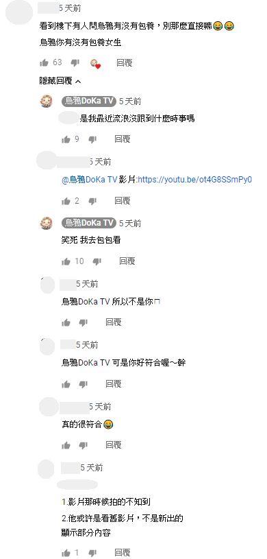 在這支影片留言區中,有網友詢問:「烏鴉你有沒有包養女生」,而烏鴉則親自回覆:「是我最近流浪沒跟到什麼時事嗎」,在網友貼上男人幫的影片之後,烏鴉則回覆:「笑死 我去包包看」,既表示影片中所說的炫富網紅並非自己,又符合一貫瘋狂的作風。