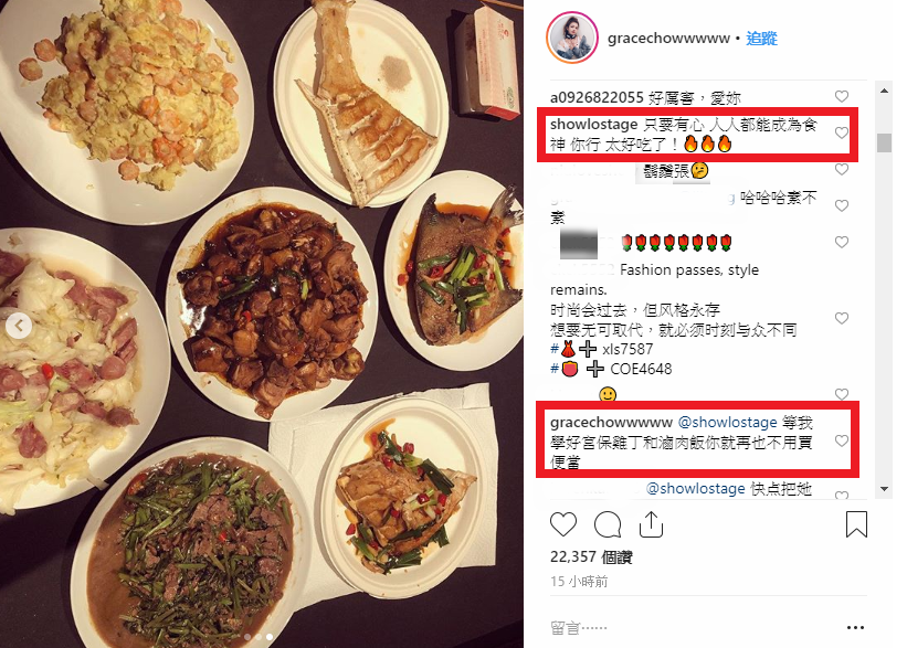 而羅志祥當然也沒有放過這個放閃的好機會,親自到底下留言大讚:「只要有心,人人都能成為食神,你行,太好吃了!」周揚青也甜蜜回覆:「等我學好宮保雞丁和滷肉飯,你就再也不用買便當了。」小倆口宛如新婚夫妻,看來周揚青也已經做好結婚後為老公洗手作羹湯的準備。