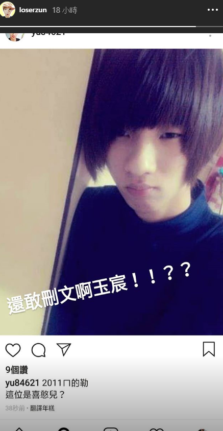 21日尊透過限時動態發布了一張小玉的IG的截圖,只見截圖中小玉打上「2011X的勒,這位是喜憨兒?」,照片中則是小玉過去的自拍照,有趣的是當時的小玉髮型相當怪異,一頭超厚的頭髮更是全部向前撥,完全就是8+9的最佳代言!不過因為小玉已經將貼文刪除,所以尊也搞笑打上「還敢刪文啊玉宸!!??」。