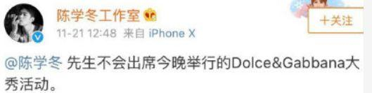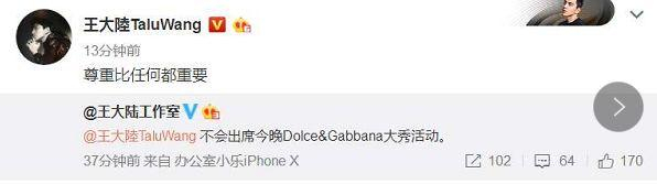 訊息爆出後,許多大陸明星紛紛表態拒絕出席 D&G 今晚的時裝大秀,其中包括了章子怡、迪麗熱巴、李冰冰、王俊凱、黃曉明、王大陸、火箭少女 101、木子洋、范丞丞等藝人,都已經確定於官方微博發出聲明,除此之外,模特兒公司東方賓利更取消指派原定將出席大秀的 24 位模特。
