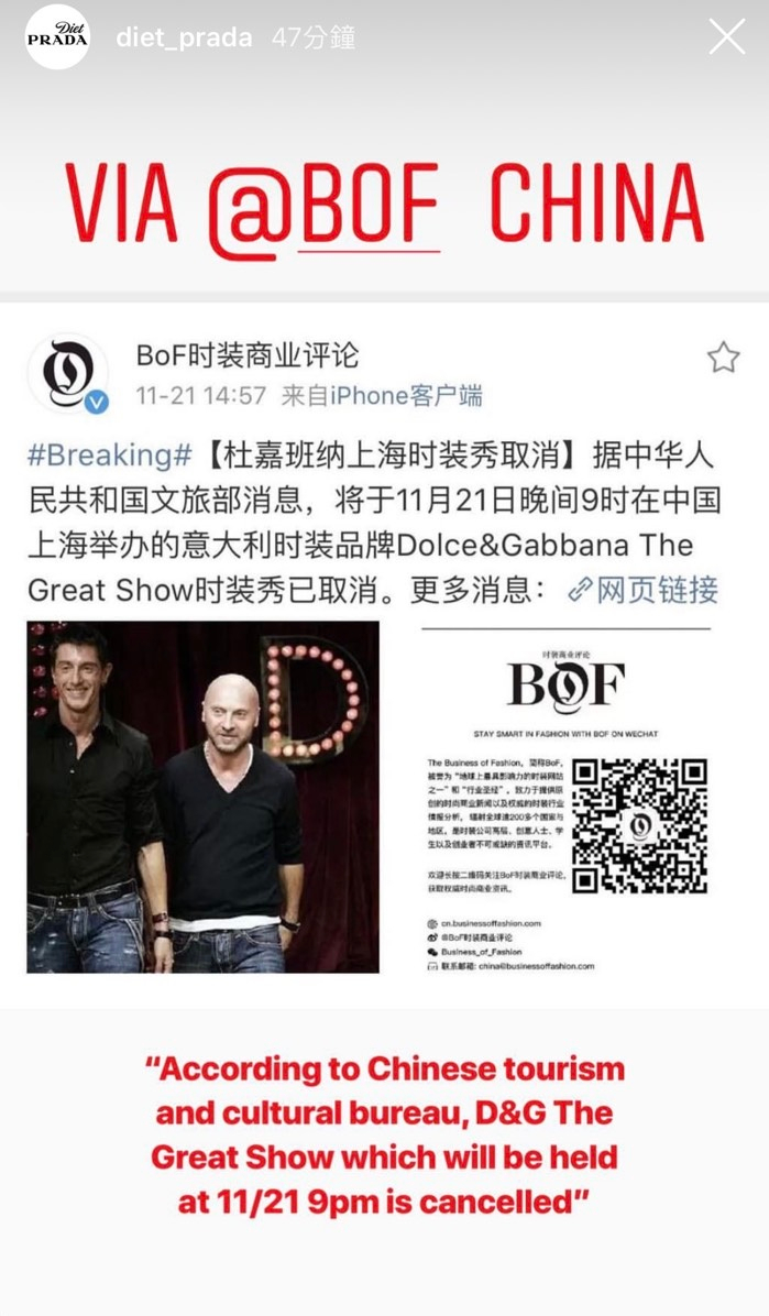 11/21 16:23 更新:原定於 11 月 21 日晚間於上海舉行的 D&G 時裝大秀已經取消。