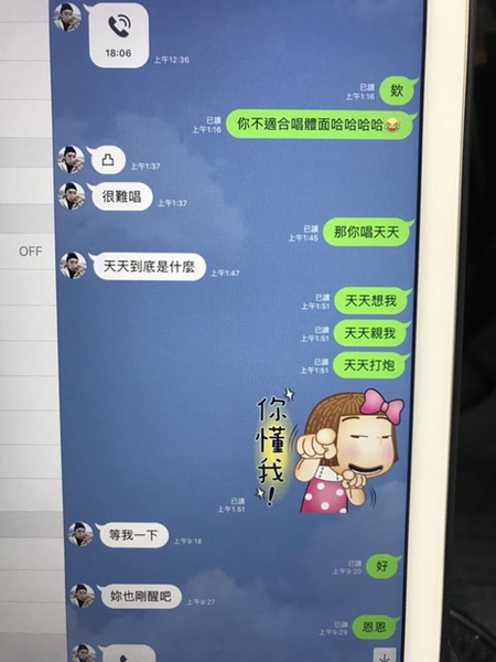 而張比比與小王的LINE對話紀錄當時也被公開,內容相當露骨,男方不僅傳了許多暗示色情的訊息,女方也回應男方的邀約,聊天的內容淨是在討論男歡女愛的過程,實在是相當的不堪,兩人之間的關係也確實可以從這些訊息當中看出些端倪,丈夫也對此加以抨擊,表示自己無法容忍這樣的行為,更因為這件事得服用精神藥物。