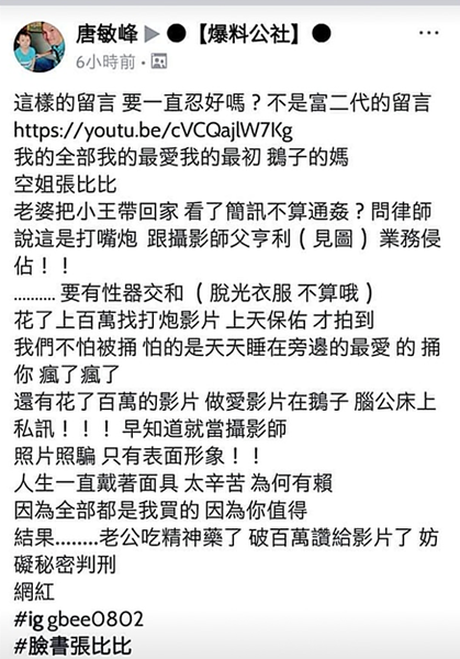 網紅空姐「Qbee張比比」因「激戰小王90分鐘」事件而一戰成名,當時引發大眾熱議,事件從今年六月開始,網紅空姐遭丈夫在臉書的不公開社團「爆料公社」控訴,表示兩人結婚已經六年,但沒想到老婆竟背著他「偷吃」攝影師小王,甚至大膽地在家裡「做那些事」,丈夫一怒之下公布了老婆與小王的LINE聊天紀錄,內容相當不堪且露骨,也引起外界關注,丈夫提起告訴後,如今網紅空姐和小王也認了兩人確實偷情,被檢察官起訴後聲請簡易判決處刑。