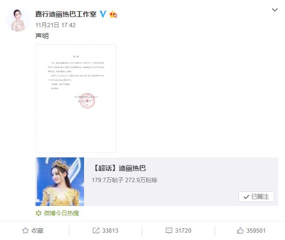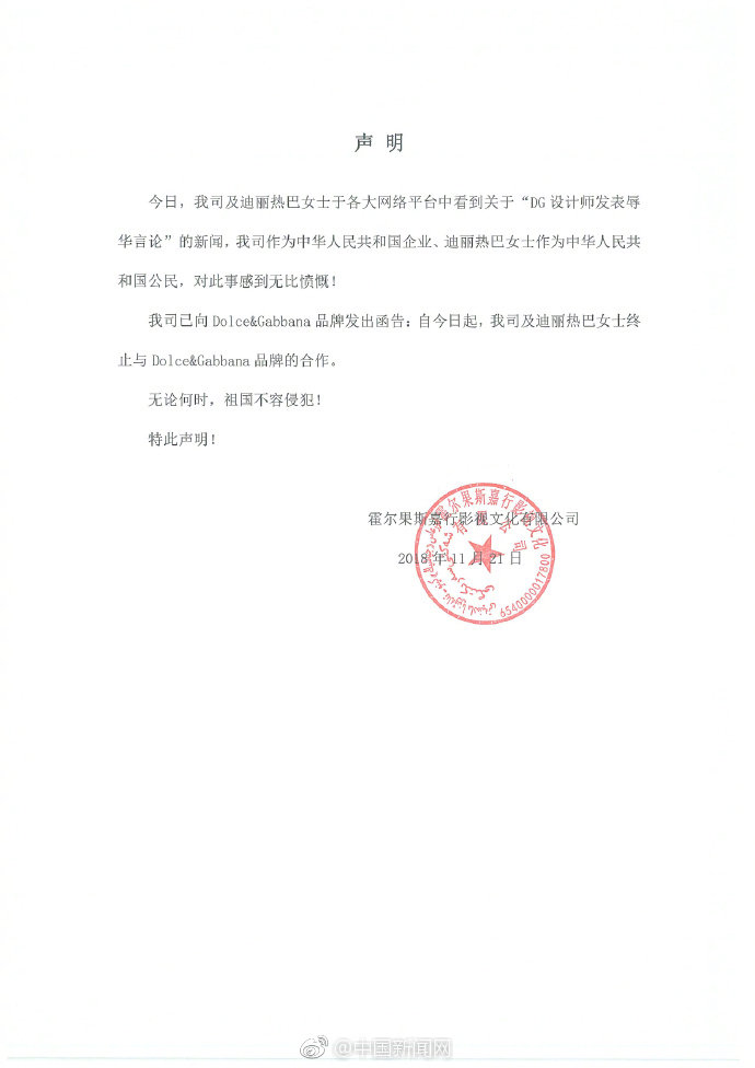 事實上在大動作刪文前,迪麗熱巴工作室的官方微博,就已經發出聲明稿,表示結束和D&G的合作。文中開頭就指名迪麗熱巴對辱華事件感到憤怒,並強烈表示「自今日起,我司迪麗熱巴女士終止與Dolce & Gabbana品牌合作」,完全展現抵制決心。