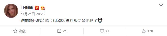 辱華事件爆發,迪麗熱巴除第一時間發表愛國宣言表示「愛你,我們最好的祖國」,更接著大動作刪去穿有品牌D&G服飾的所有照片。根據迪麗熱巴粉絲團「撲倒迪」指出,迪麗熱巴幾乎每隔1分鐘就上線刪文,就連10月底風光奪得金鷹視后的照片,甚至是和粉絲互動的福利照都一條不剩,讓粉絲直呼「後悔沒有保留照片」,更有大批粉絲在網上尋求照片。