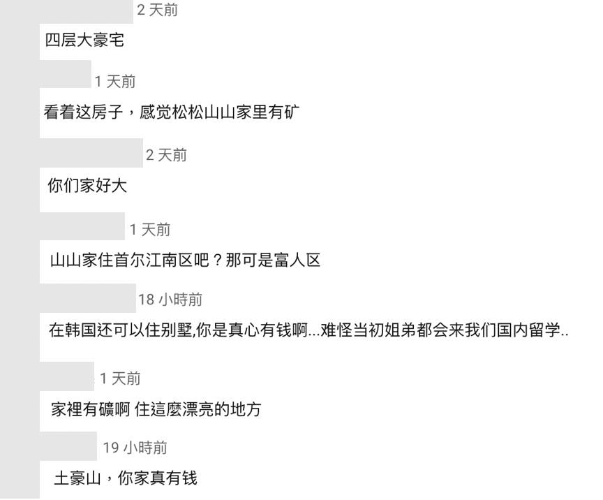 這次山山在家裡惡作劇時,攝影機也拍到一些他們家的景象,不少網友看完紛紛猜測他是不是很有錢,表示:「四層大豪宅」、「看著這房子,感覺松松山山家裡有礦」、「你們家好大」、「山山家住首爾江南區吧?那可是富人區」、「在韓國還可以住別墅,你是真心有錢啊...難怪當初姐弟都會來我們國內留學..」、「家裡有礦啊 住這麼漂亮的地方」